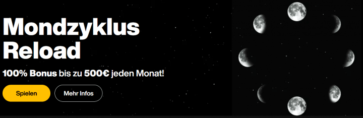Das Online Casino überzeugt auch mit einem monatlichen Reload Bonus, der mit 100% bis zu 500€ ebenfalls großzügig ausfällt. Mit dem Bonuscode "MOON" und einer Einzahlung von mindestens 30€ kann dieses Bonusangebot im JustCasino aktiviert werden. Wichtig ist aber auch hier, dass du zuvor innerhalb eines Monats bereits eine Einzahlung getätigt hast und den Bonus 40-fach umsetzen musst, bevor eine Auszahlung deiner Gewinne möglich ist.