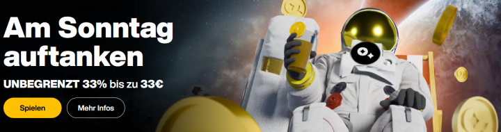 Diesen Casino Bonus kannst du dir am Sonntag so oft schnappen, wie du möchtest. Eine Mindesteinzahlung von 30€ unter Angabe des Bonuscode "REFUEL" berechtigt dich, einen 50% Bonus bis zu 100€ zu erhalten. Wir sind der Meinung, dass sich dieser Bonus auch optimal für Highroller eignet. Aber auch hier muss der Bonusbetrag mindestens 40-mal umgesetzt werden, bevor eine Gewinnauszahlung beantragt werden kann.