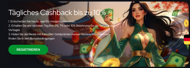 Das Katsubet Casino ist im japanischen Stil gehalten, aber wirkt dabei nicht übertrieben, sondern ansprechend. Der dunkle Hintergrund und die grünen Elemente, gepaart mit den Grafiken, wirken professionell. Auch die Orientierung fällt auf der Seite intuitiv aus. Oben rechts kannst du dich registrieren oder einloggen. Dort findest du nach der Anmeldung dein aktuelles Statuslevel, das aktuelle Guthaben sowie die Möglichkeit, Einzahlungen vorzunehmen.