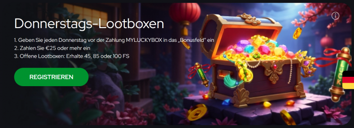 Mit dem Code MYLUCKYBOX kannst du am Donnerstag bei einer Einzahlung ab 25€ eine Box auswählen. Diese enthält 45, 85 oder 100 Freispiele.