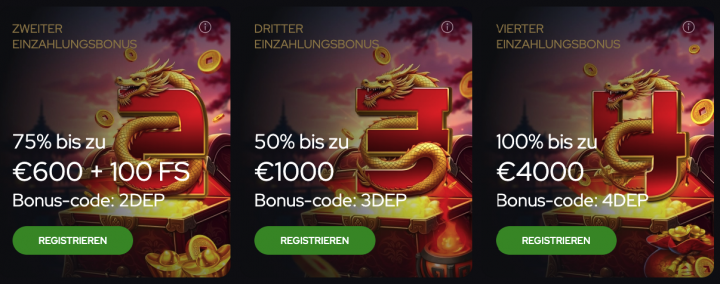 Nach deiner Registrierung kannst du den Willkommensbonus beanspruchen. Du aktivierst das Paket mit deiner ersten Einzahlung von mindestens 20€. Bei der Ersteinzahlung musst du keinen Katsubet Casino Bonuscode eingeben, bei den nachfolgenden 3 Einzahlungen ist es jedoch erforderlich, einen Code einzugeben.