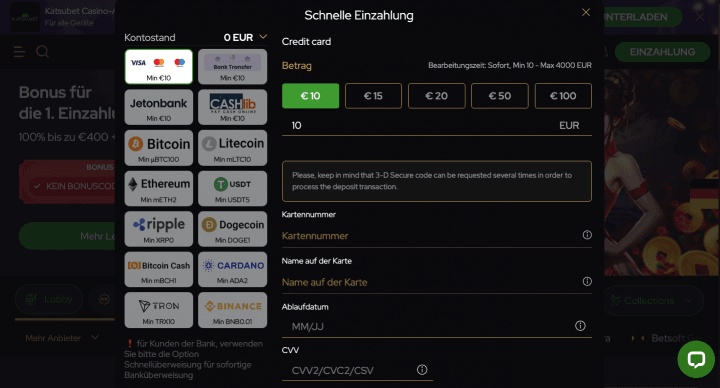 Das Online Casino Katsubet berechnet keine Gebühren für Zahlungen. Für gewöhnlich steht das Guthaben umgehend zur Verfügung, die Bearbeitungszeit bei Kryptos kann jedoch einige Minuten dauern.