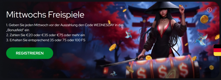 Wenn du am Mittwoch bei deiner Einzahlung den Code WEDNESDAY eingibst, kannst du dir Freispiele sichern. Die Anzahl hängt dabei von der Einzahlungssumme ab und jede Woche wird ein neuer Slot ausgewählt.