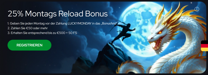 Du kannst dir am Montag einen 25%-Bonus sichern und erhältst außerdem 50 Freispiele für das Spiel der Woche. Hierfür musst du den Bonuscode LUCKYMONDAY eingeben. Der Bonus setzt eine Mindesteinzahlung von 50€ voraus.
