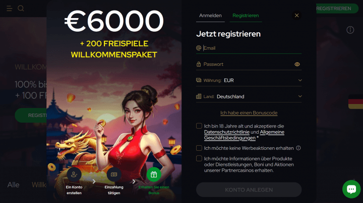 Du wirst nach einer abgeschlossenen Registrierung in den Kassenbereich weitergeleitet und kannst das Willkommenspaket mit der Ersteinzahlung aktivieren. Achte auf die Mindesteinzahlung, um eine automatische Gutschrift zu aktivieren.