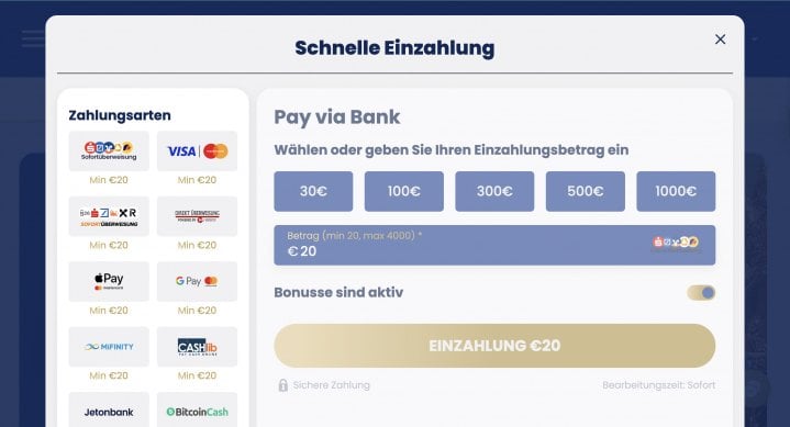 Bei der Ersteinzahlung kannst du das Willkommenspaket aktivieren. Bei den ersten 4 Einzahlungen kannst du dabei einen Bonus von insgesamt bis zu 4.000€ und 300 Freispielen erhalten. Während bei der ersten Einzahlung kein Bonuscode notwendig ist, musst du bei den darauf folgenden Transaktionen einen Code eingeben. Die Mindesteinzahlung beträgt 20€.