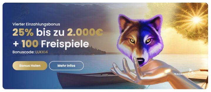 - 4. Einzahlungsbonus - 25% bis zu 2.000€ und 100 Freispiele, Bonuscode: „LUKKI4”