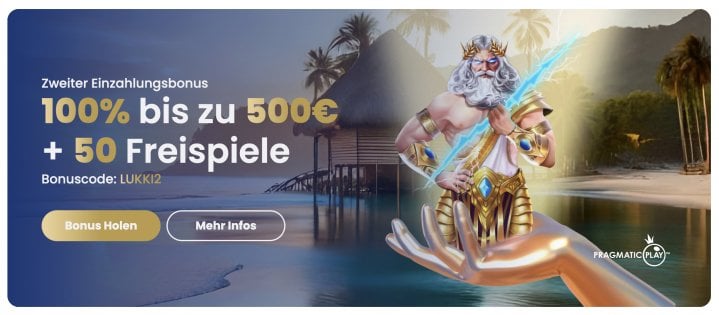 - 2. Einzahlungsbonus - 100% bis zu 500€ und 50 Freispiele, Bonuscode: „LUKKI2”