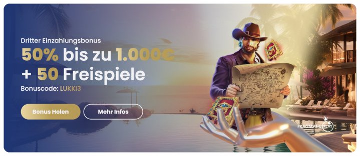 - 3. Einzahlungsbonus - 50% bis zu 1.000€ und 50 Freispiele, Bonuscode: „LUKKI3”