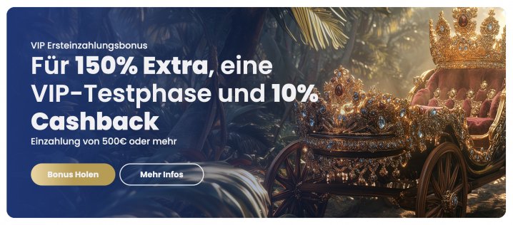 - Highroller Bonus – 150% bis zu 6.000€, 60 Tage VIP-Testzugang und 10% Cashback