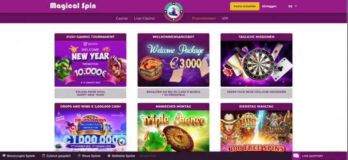 Jedes Online-Casino, das etwas auf sich hält, sollte eine gute Auswahl von Boni und Aktionen für neue und bestehende Mitglieder anbieten. Das Magical Spin Casino fällt ganz sicher in diese Kategorie, denn Sie können sich auf einen Willkommensbonus, Reload-Boni, Freispiele, Turniere und eine ganze Menge mehr freuen.