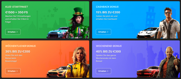 Das Treueprogramm ist in 50 Stufen und fünf “Rennphasen” unterteilt – von Debütrennen bis Triumph-Rennen. Wer Slots spielt, sammelt Punkte und steigt automatisch Level um Level auf. Für jeweils 15€ Einsatz gibt es einen Punkt, der neue Belohnungen freischaltet. Darunter finden sich etwa Freispiele, ein Bonusguthaben oder weitere Belohnungen. Der gesamte Aufbau ist spielerisch gestaltet, fast wie ein Rennen, bei dem man Runde für Runde näher an den nächsten Preis kommt. Besonders für aktive Spieler lohnt sich das Treueprogramm.