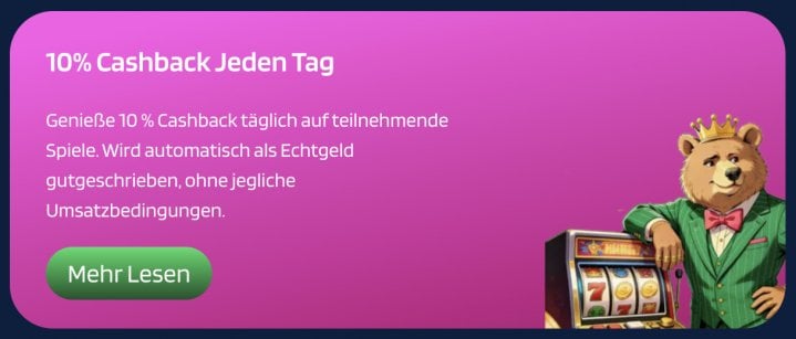 - Täglich 10% Cashback ohne Umsatzbedingungen