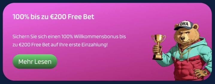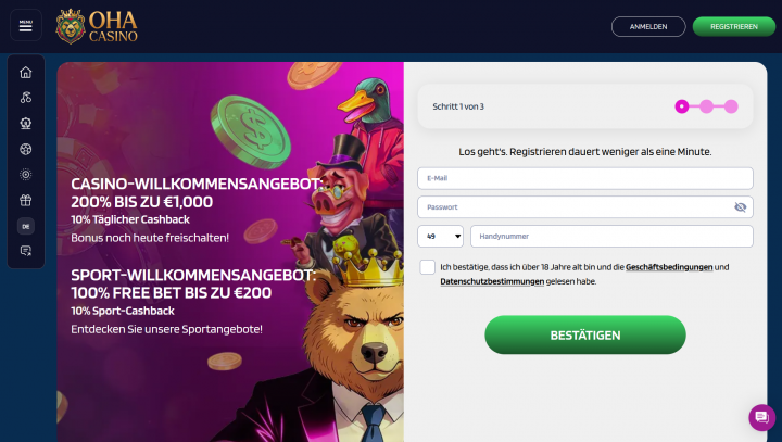 Als Neukunde steht dir direkt nach deiner Registrierung ein Ersteinzahlungsbonus bereit. Mit diesem kannst du deine Einzahlung bis zu einem Betrag von 1.000€ verdreifachen. Einen Oha Casino Bonuscode haben wir für die Einlösung des Neukundenbonus nicht benötigt.