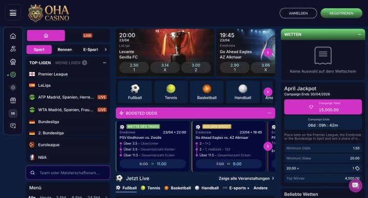 Neben dem Casino bietet OhaCasino auch ein umfangreiches Wettangebot. Du kannst auf klassische Sportarten wetten, findest aber auch Bereiche für E-Sports sowie virtuelle Wetten. Damit ist die Auswahl breit aufgestellt und deckt unterschiedliche Interessen ab.