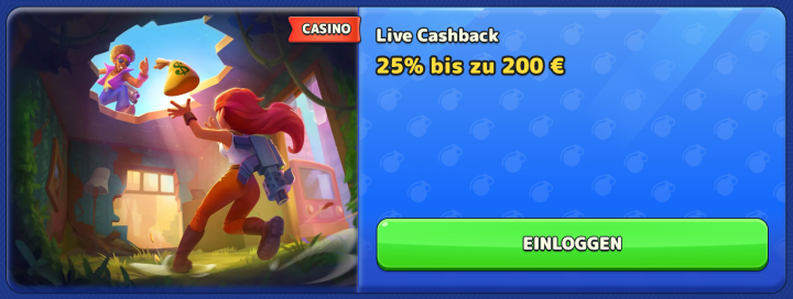 Den Live Casino Cashback Bonus hingegen erhalten alle Spieler. Dieser beträgt 25% bis zu 200€ und muss nur einmal umgesetzt werden. Die Gutschrift erfolgt hierbei jedoch nicht automatisch, sondern du musst dich am Montag direkt an den Kundendienst via Live-Chat oder E-Mail wenden, um die Gutschrift zu beantragen.