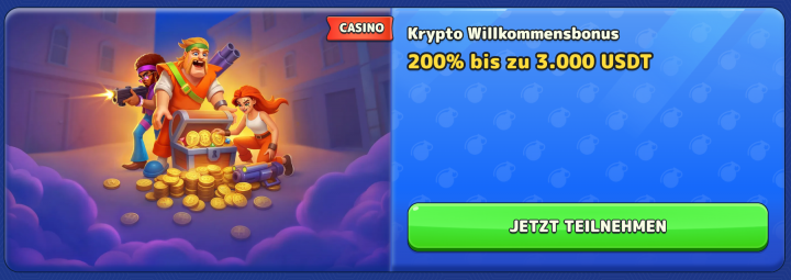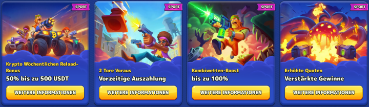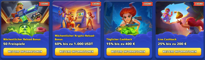 Verfügbar von Montag bis Donnerstag, Mindesteinzahlung 20€ - Wöchentlicher Krypto Reload Bonus - 75% bis zu 750 USDT und 50 Freispiele
