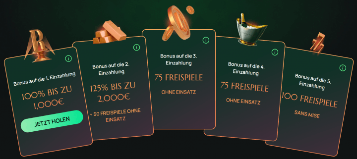 Direkt nach deiner Registrierung kannst du dir für deine ersten 5 Einzahlungen einen Bonus von bis zu 3.000€ und 300 Freispiele sichern. Im Anschluss stehen dir als Bestandskunde tägliche Bonusangebote zur Verfügung, sodass du regelmäßige Boni in Anspruch nehmen kannst.