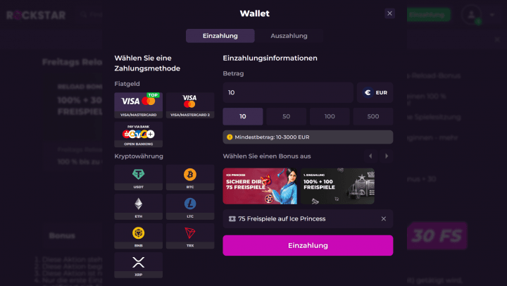 Die Mindesteinzahlung liegt bei 10€, bei der Verwendung von Kryptowährungen kann diese basierend auf dem aktuellen Umrechnungskurs etwas höher ausfallen. Es ist egal, welche Zahlungsart du nutzt, seitens des Rockstar Casinos werden dir keine Gebühren für deine Einzahlung berechnet.