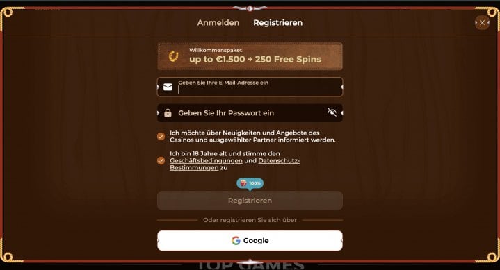 - Du kannst aber auch oben rechts auf „Registrieren“ klicken, um das Formular zu öffnen. Wenn du deinen Google-Account nutzen möchtest, kannst du noch schneller ein Spielerkonto anlegen.