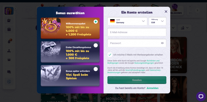 - Klicke nun oben rechts auf den Button “Registrieren”. Du kannst jetzt direkt den gewünschten Bonus und deine Währung auswählen. Vervollständige das Formular dann mit deiner E-Mail-Adresse und einem sicheren Passwort und klicke auf den Button “Senden”.