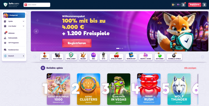 Schon beim ersten Besuch fällt auf, dass SafeCasino seinem Namen auch optisch gerecht werden möchte. Das Design wirkt freundlich, modern und klar strukturiert. Die Kombination aus violett-blauen Farbverläufen, verspielten Animationen und dem charmanten Fuchs-Maskottchen sorgt für eine einladende Atmosphäre, die sofort Vertrauen schafft. Trotz des verspielten Stils bleibt die Seite übersichtlich und alle wichtigen Kategorien wie Spiele, Live-Dealer, Aktionen oder das VIP-Programm sind in der linken Navigationsleiste leicht erreichbar.