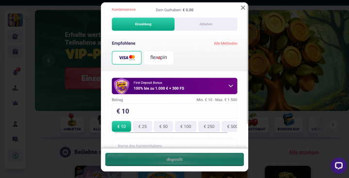 - Deine Anmeldung ist jetzt abgeschlossen und du wirst zur Kasse weitergeleitet. Wähle dort dann die von dir gewünschte Zahlungsmethode aus und nimm die entsprechende Mindesteinzahlung vor, um deinen Bonus zu aktivieren.