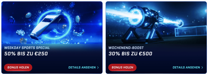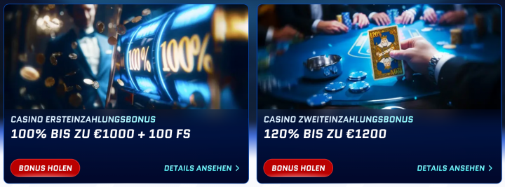 Alle registrierten Spieler können laufend Bonusangebote in Anspruch nehmen. Bereits bei der Ersteinzahlung hast du die Wahl zwischen einem Casino Willkommensbonus und einem Sportwetten Bonus. Weitere Belohnungen erhältst du durch Herausforderungen oder im Treueclub.