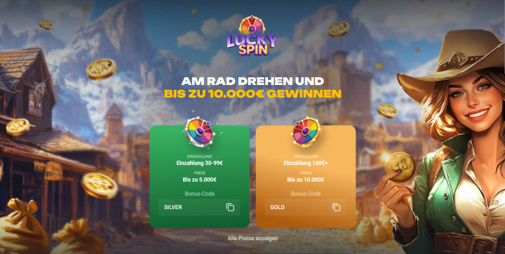 Statt eines Bonus kannst du dir mit jeder Einzahlung auch die Chance auf bis zu 10.000€ sichern. Mit dem Lucky Spin Glücksrad von Slothunter lassen sich tolle Preise gewinnen. Bei einer Einzahlung zwischen 30€ und 99€ gibst du hierzu einfach den Bonuscode "SILVER" ein mit der Chance auf bis zu 5.000€. Ab einer Einzahlung von 100€ nutzt den Bonuscode "GOLD" und kannst mit etwas Glück bis zu 10.000€ gewinnen.