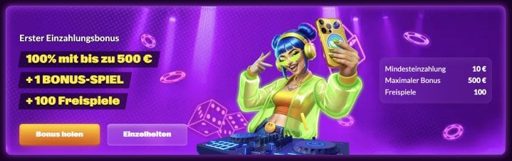- 1. Einzahlungsbonus - 100% bis zu 500€, 100 Freispiele und 1 Bonus-Buy-Runde