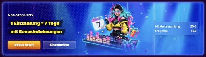 - Non-Stop Party - einmal einzahlen, 7 Tage einen Bonus erhalten