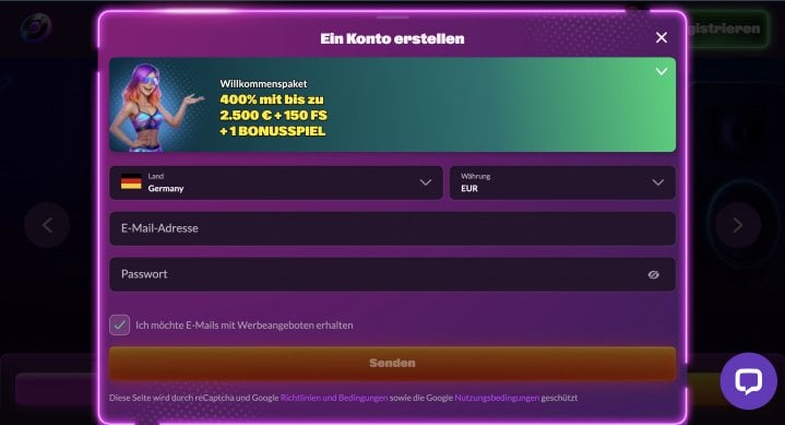 - Wähle jetzt den gewünschten Bonus sowie dein Land und deine Währung aus. Gib danach noch deine E-Mail-Adresse sowie ein Passwort ein und klicke danach auf den Button „Senden“.