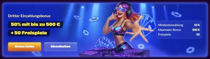 - 3. Einzahlungsbonus - 50% bis zu 500€ und 50 Freispiele