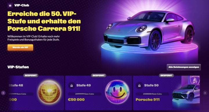 SlotRave liefert basierend auf unserem Test ein stimmiges Gesamtpaket mit klarem Fokus auf Slots und einer großen Auswahl an Spieleherstellern. Besonders das Willkommenspaket mit bis zu 400% Bonus bis zu 2.500€, 150 Freispiele und zusätzlicher Bonus-Buy-Runde konnte uns dabei ansprechen. Einzahlungen sind hier bereits ab 10€ möglich. Auch das VIP-Programm ist umfangreich aufgebaut und reicht bis zu 50 Stufen, mit dem Highlight auf der höchsten Stufe, bei der dich ein Porsche 911 erwartet.
