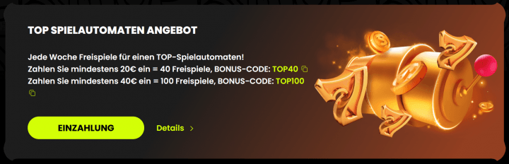Du kannst dir jede Woche 40 bzw. 100 Freispiele für einen Top-Spielautomaten sichern. Hierzu nimmst du einfach eine Einzahlung von 20€ (Bonuscode "TOP40") bzw. 40€ vor (Bonuscode "TOP100"), um die Freispiele zu aktivieren. Das Angebot ist einmal wöchentlich verfügbar und die Gewinne aus den Freispielen müssen 45-mal umgesetzt werden.