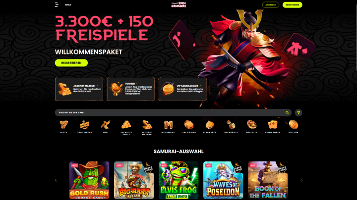 Mit mehr als 5 Jahren Erfahrung seit der Gründung 2020 Ist das Spin Samurai Casino mittlerweile ein fester Bestandteil in der Branche des Online Glücksspiels und durchaus beliebt bei Spielern. Einer der Gründe ist dabei wahrscheinlich der ansehnliche 3.300€ Willkommensbonus mit 150 Freispielen.