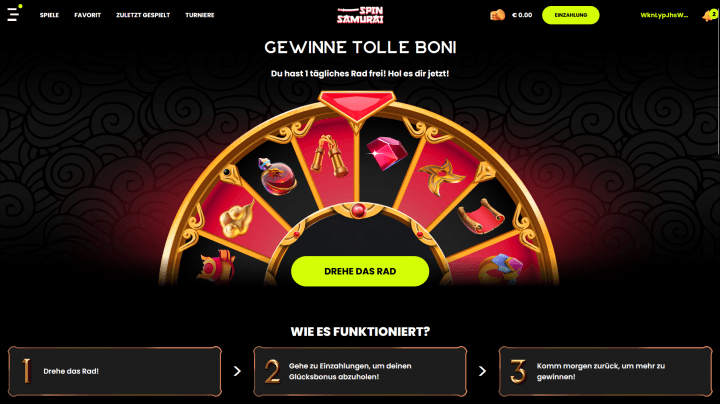 Mit dem Glücksrad in der Spin Samurai Online Spielothek erhältst du jeden Tag einen gratis Dreh. Deinen gewonnenen Bonus kannst du einlösen, wenn du im Kassenbereich mindestens 30€ einzahlst.