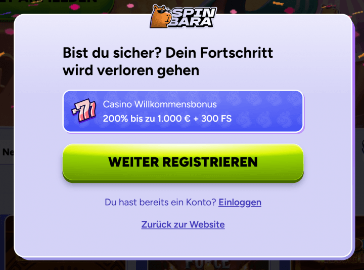 Etwas schwach hingegen sieht es im Bereich der Reload Bonusangebote aus, da diese nicht so umfangreich sind, wie wir das von anderen Casinos kennen. Ebenso ist uns dabei aufgefallen, dass das Thema Spielerschutz hier eher im Hintergrund steht und es keine Möglichkeiten zur Selbstlimitierung gibt. Zusammengefasst liefert das SpinBara Casino jedoch ein solides Gesamtpaket, das an einigen Stellen noch verbesserungswürdig ist. Wenn du dir jetzt deinen 200% bis zu 1.000€ Bonus sowie die dazugehörigen Freispiele schnappen möchtest, musst du lediglich auf unseren Link klicken und dich im SpinBara Casino registrieren.