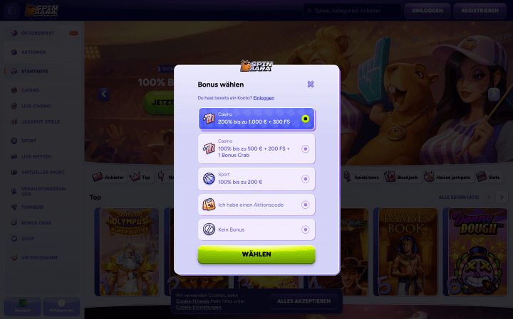 - Dir wird nun eine Auswahl der verfügbaren Boni (Casino Neukundenbonus und Wettbonus) angezeigt. Ebenso hast du dort die Möglichkeit, einen SpinBara Bonus Code einzugeben oder auf einen Bonus zu verzichten. Deine Auswahl bestätigst du mit einem Klick auf den Button “Wählen”.