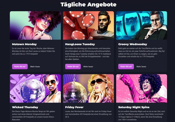 Zum Ausklang der Woche steht dir jeden Sonntag ein 50% Reload Bonus bereit, den du mit einer Einzahlung von mindestens 50€ nutzen kannst. Hierbei gilt ein maximales Gewinnlimit von 1.000€.