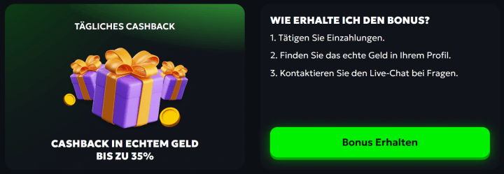 Du kannst auch die tägliche Bonuskarte erkunden, um dir jeden Tag einen anderen Reload Bonus zu sichern. Hierbei handelt es sich jeweils um eine Kombination aus einem Einzahlungsbonus und zusätzlichen Freispielen. Den entsprechenden Bonus kannst du jeden Tag im Kassenbereich auswählen und dir diesen dann mit einer Mindesteinzahlung von 25€ gutschreiben lassen.