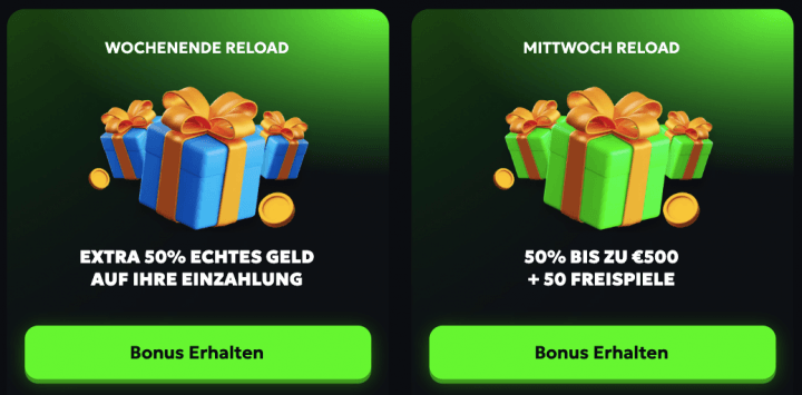 - Reload Bonus am Mittwoch - 50% bis zu 500€ und 50 Freispiele