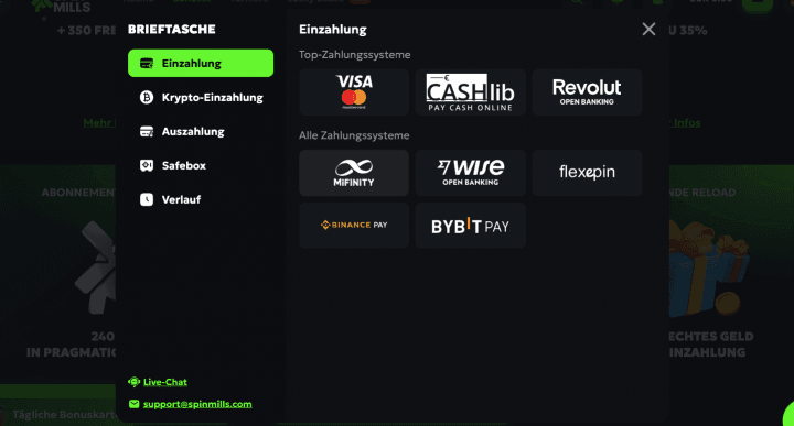 SpinMills Casino Zahlungsmethoden, Auszahlungsdauer und Limits