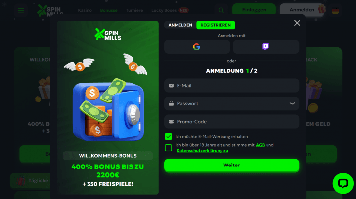 SpinMills Casino Willkommensbonus - Neukunden erhalten 400% Bonus bis zu 2.200€ und 350 Freispiele