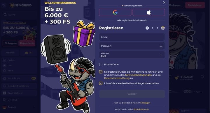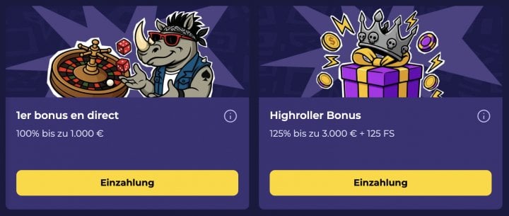 Abgerundet wird das Angebot für Neukunden mit einem speziellen Highroller Bonus von bis zu 3.000€. Die entsprechenden Boni werden dir direkt im Kassenbereich angezeigt. Somit ist es nicht notwendig, einen Spinorhino Casino-Bonuscode einzugeben. Du kannst alternativ auch auf ein Willkommenspaket für das Wettangebot des Casinos zurückgreifen.