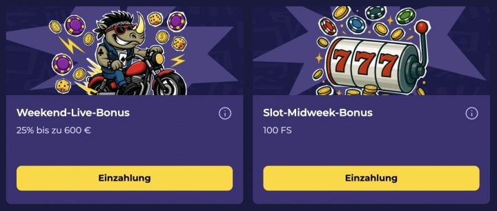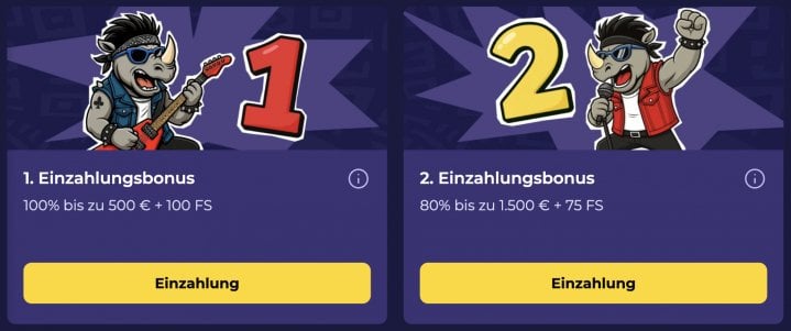 Ob Casino Willkommensbonus, Highroller Bonus, Live Casino Bonus oder ein Sportwetten Willkommenspaket – bei Spinorhino sind wir auf eine vielfältige Auswahl unterschiedlicher Bonusangebote gestoßen. Zusätzlich dazu gibt es auch wöchentliche Reload Boni für Bestandskunden.