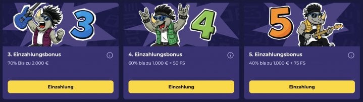 Bei Spinorhino konnten wir eine wirklich gute Auswahl an Willkommensboni vorfinden. Hier steht dir zum einen ein Willkommenspaket bereit, mit dem du dir über fünf Einzahlungen hinweg bis zu 6.000€ Bonusguthaben und 300 Freispiele sichern kannst.