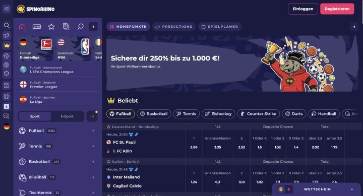 Der Sportwettenbereich bei Spinorhino ist übersichtlich aufgebaut und ermöglicht dir einen schnellen Einstieg. Besonders hervorzuheben ist der Spielplaner, der dir jederzeit einen klaren Überblick über anstehende Events bietet. So können wir gezielt Spiele auswählen und unsere Wetten ohne langes Suchen platzieren.