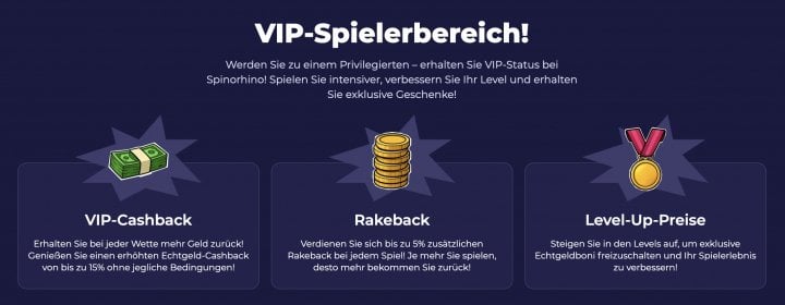Mit dem 5-stufigen VIP-Programm profitierst du bei Spinorhino von vielen weiteren Vorteilen. Wir haben hier neben einem Cashback auch ein Rakeback gefunden. Je nach erreichter Stufe erhältst du dann zwischen 5% und maximal 15% tägliches Cashback gutgeschrieben. Das Cashback hat eine Laufzeit von 24 Stunden und unterliegt keinen Umsatzbedingungen.
