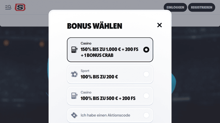 Bei SupaBet kannst du direkt zu Beginn auswählen, welchen Bonus du nutzen möchtest. Für das Casino steht dir ein exklusiver 150% Bonus von bis zu 1.000€ zur Verfügung. Alternativ kannst du dich für den 200€ Sportwetten Bonus entscheiden.